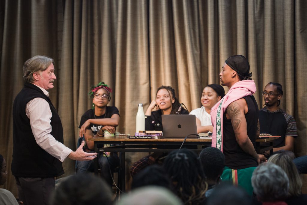 Under the direction of artist and activist Gina Belafonte, this collective subsequently represented their work as a one-act forum theatre play at the California African American Museum in spring 2019. There they were joined by an alliance of USC students from multiple schools who conceived and presented a breathtaking performance installation centered upon two repurposed jail beds. This project was a continuation of JusticeLA’s Jail Bed Drop.